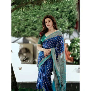 Generic Women’s Litchi silk Printed Saree With Unstitched Blouse (Dark Blue)