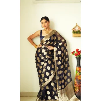 Generic Women’s Litchi silk Printed Saree With Unstitched Blouse (Navy Blue)