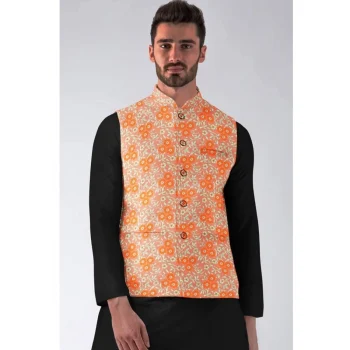 Generic Men’s Jacquard Printed Full Sleeve Waistcoat (Orange-Beige)