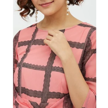 Generic Women’s Polyester Checkered 3-4th Sleeves Below Knee Dress (Pink)