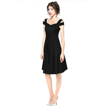 Generic Women’s Polyester Solid V Neck Cap Sleeve off Shoulder Dress (Black)