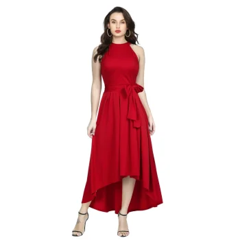 Generic Women’s Polyster Solid Halter Neck Sleeveless Dress (Red)
