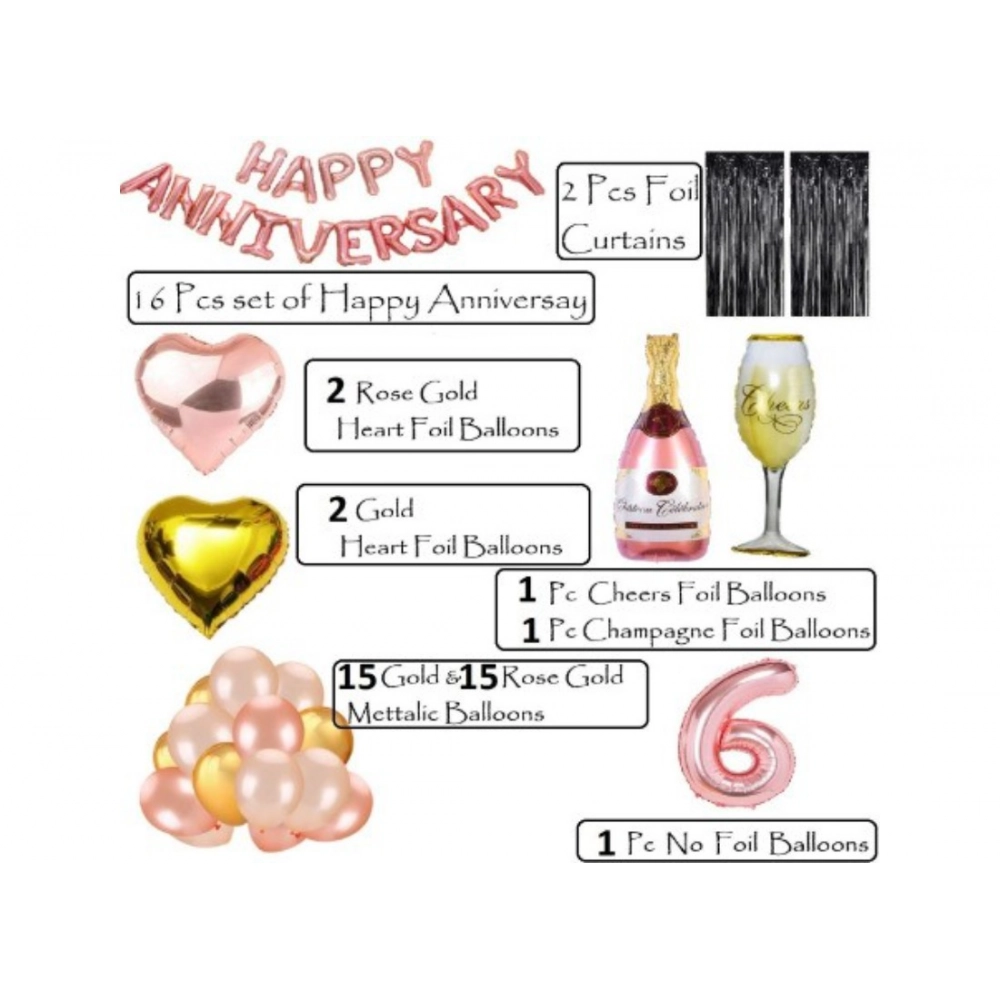 • Package Contains: 1 Happy Anniversary Rose Gold Foil 30 HD Metallic Rose Gold & Gold Balloons 2 Rose Gold Heart shape Foil Balloons + 2 Gold Heart Shape Foil Balloons 1 Pc Cheers Foil Balloon & 1 pc Rose Gold Foil Balloon + 2 Black Foil Fringe Curtain ,Rose gold Selective foil number