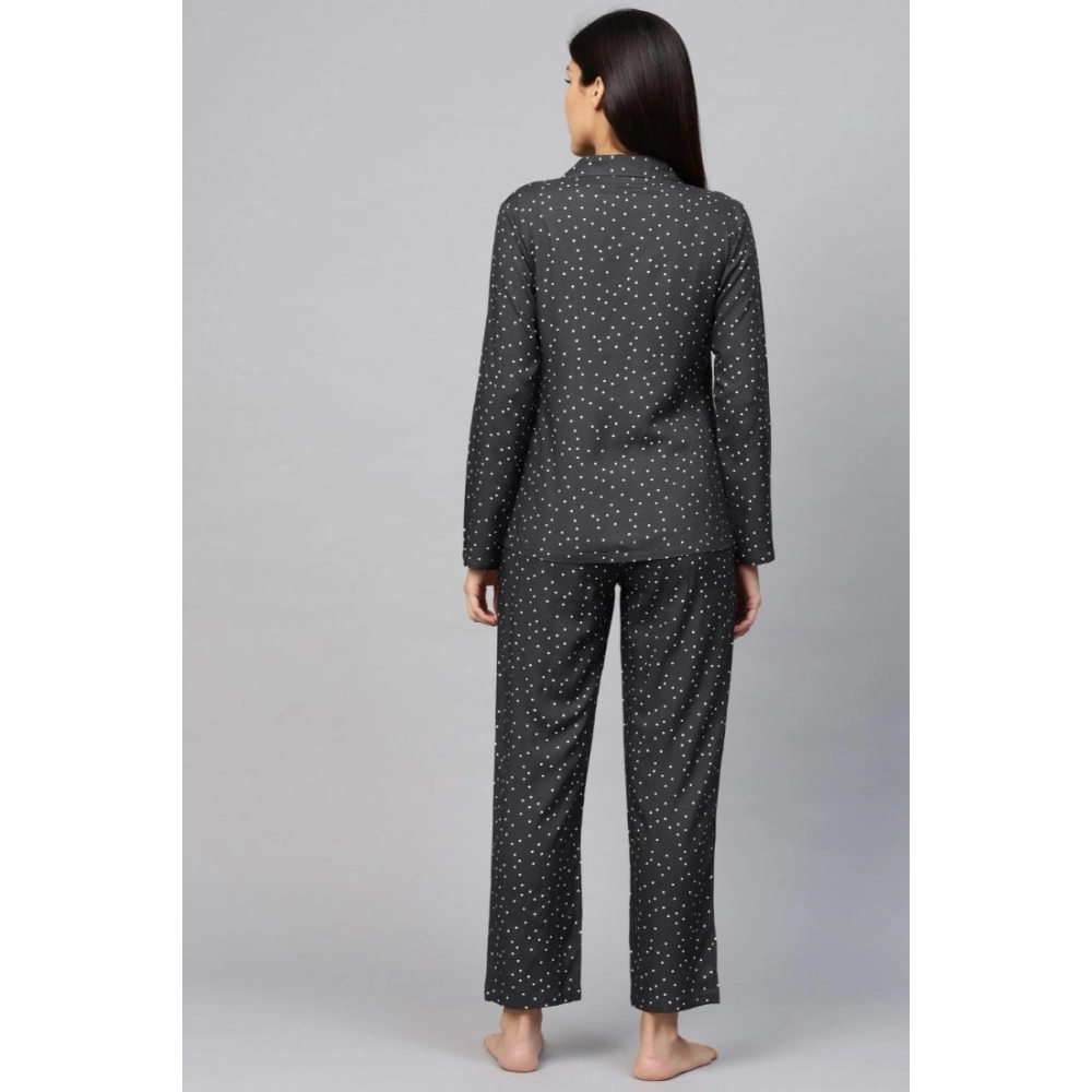 Generic Women’s Casual Full Sleeves Polka Dot Printed Rayon Shirt With Pyjama Pant Night Suit Set (Grey)